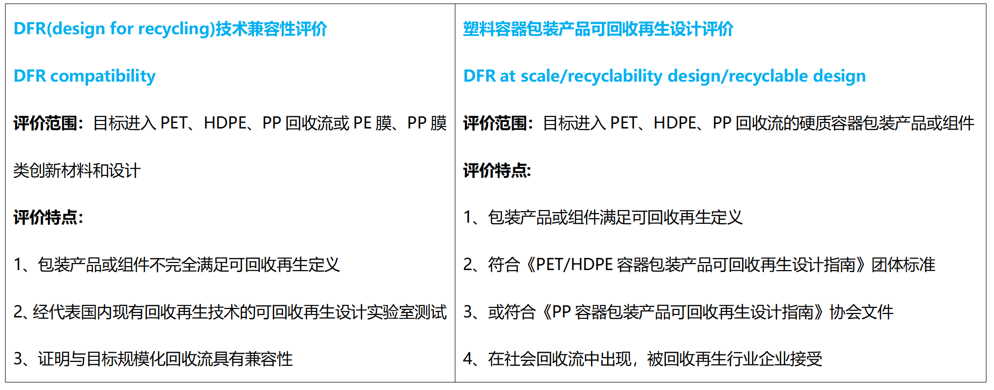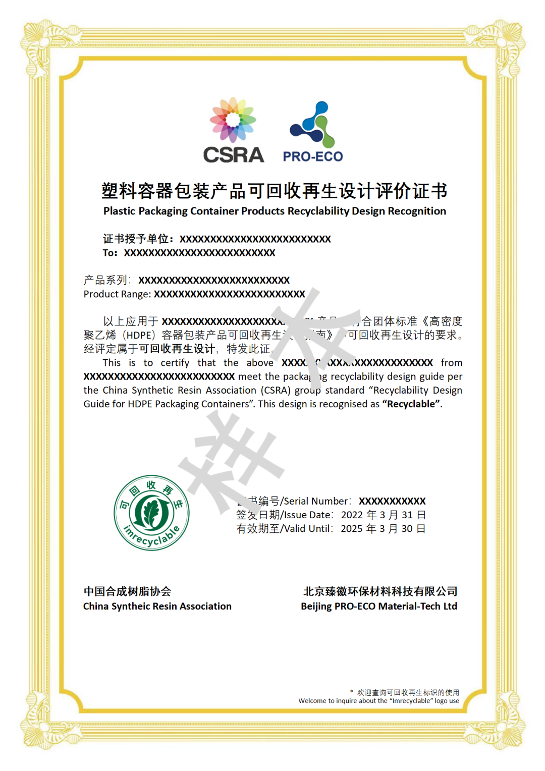 ในเดือนมีนาคม 2022 กลุ่มสมาคมเรซินสังเคราะห์แห่งประเทศจีนได้กำหนดมาตรฐาน "คู่มือการออกแบบสำหรับการรีไซเคิลและการรีไซเคิลบรรจุภัณฑ์และผลิตภัณฑ์บรรจุภัณฑ์โพลีเอทิลีนเทเรฟทาเลต (PET)" และ "คู่มือการออกแบบสำหรับการรีไซเคิลและการรีไซเคิลบรรจุภัณฑ์และผลิตภัณฑ์บรรจุภัณฑ์โพลีเอทิลีนความหนาแน่นสูง (HDPE)" เปิดตัวอย่างเป็นทางการ พร้อมเปิดตัว "การประเมินการออกแบบบรรจุภัณฑ์รีไซเคิลได้ของผลิตภัณฑ์บรรจุภัณฑ์พลาสติก" และออกกรณีการออกแบบผลิตภัณฑ์ที่ได้รับการประเมินชุดแรก