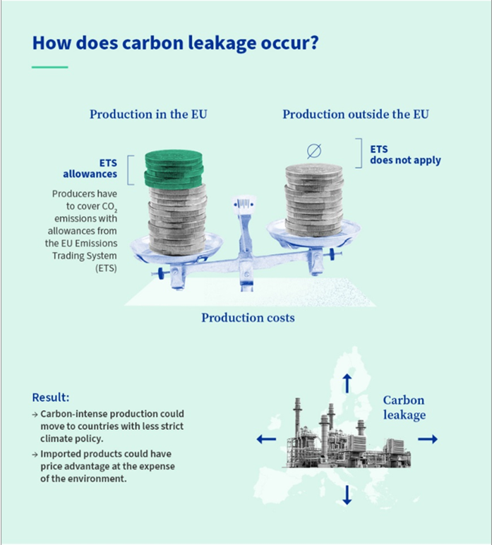CBAM มีเป้าหมายเพื่อป้องกัน "การรั่วไหลของสารคาร์บอน" ซึ่งหมายถึงข้อเท็จจริงที่ว่าเส้นทางคาร์บอนคู่ที่เข้มงวดมากขึ้นในภูมิภาคจะส่งผลให้ต้นทุนคาร์บอนเพิ่มขึ้นในภูมิภาค ส่งผลให้บริษัทต่างๆ ที่ผลิตผลิตภัณฑ์คาร์บอนสูงต้องย้ายไปยังคาร์บอนต่ำ พื้นที่ต้นทุนคาร์บอน ส่งผลให้เกิดการถ่ายเททางอุตสาหกรรม ภายใต้แผนงานคาร์บอนคู่ของสหภาพยุโรป โควต้าคาร์บอนจะค่อยๆ เข้มงวดขึ้นจนกว่าจะหมดไป และต้นทุนคาร์บอนขององค์กรก็จะเพิ่มขึ้นตามไปด้วย และราคาของผลิตภัณฑ์คาร์บอนสูงก็จะเพิ่มขึ้นเช่นกัน ส่งผลให้ตลาดนำเข้าผลิตภัณฑ์คาร์บอนสูงจาก นอกสหภาพยุโรปหรือโอนสายการผลิตผลิตภัณฑ์คาร์บอนสูงไปยังพื้นที่ที่มีต้นทุนคาร์บอนต่ำนอกสหภาพยุโรปซึ่งจะส่งผลเสียหายต่อเศรษฐกิจของสหภาพยุโรป ในฐานะที่เป็นกลไกสมดุลต้นทุนคาร์บอนในประเทศและต่างประเทศ CBAM จะช่วยลดการเกิดการรั่วไหลของคาร์บอนได้ในระดับหนึ่ง